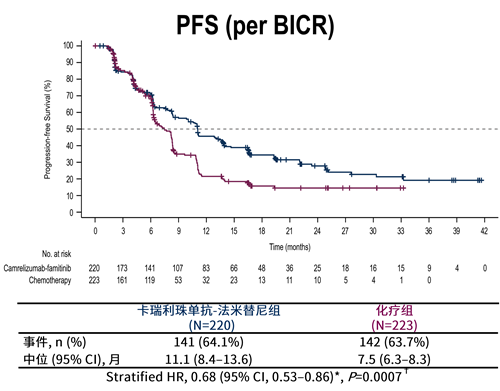 SHR-1210-III-329研究是一项随机、开放标签、对照、多中心的III期研究,研究纳入443例既往针对复发或转移性疾病未接受过全身治疗的经过组织病理学证实的复发或转移性宫颈鳞癌患者,依据PD-L1联合阳性评分(≥1 vs <1)和既往是否使用铂类化疗(是 vs 否)1:1随机为卡瑞利珠单抗-法米替尼组(卡瑞利珠单抗 200 mg IV Q3W,至多35个周期+法米替尼 20 mg PO QD)和化疗组(含铂化疗 IV Q3W,至多6个周期±贝伐珠单抗 15 mg/m2 IV Q3W),治疗直到每种方案的最大周期数、确认疾病进展、无法忍受的毒性、撤回同意、失去随访或研究者决定。